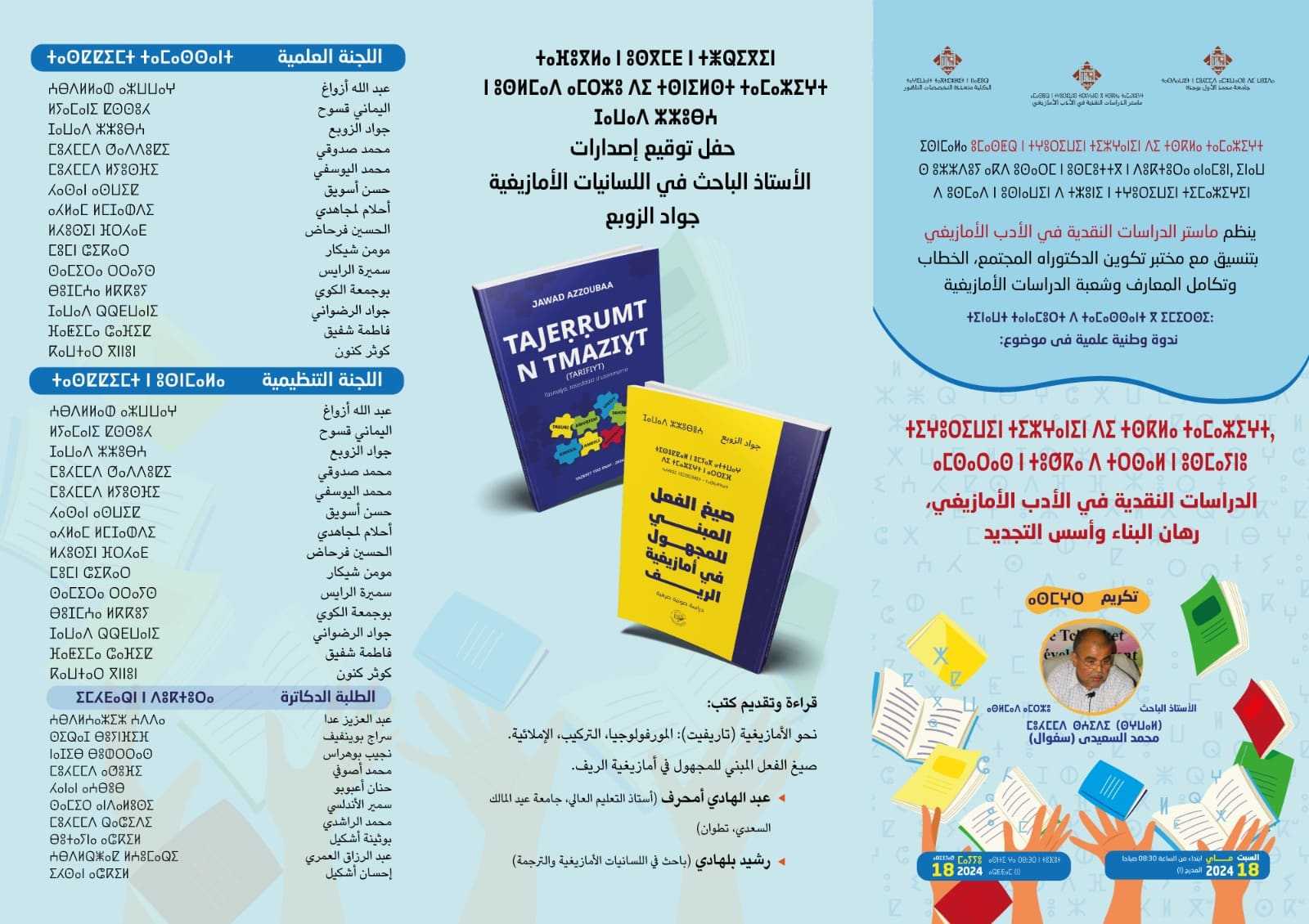سيتم تكريم الدكتور محمد السعيدي (سغوال) تقديرًا لإسهاماته في الدراسات الأمازيغية. كما سيتم توقيع إصدارات جديدة للباحث الدكتور جواد الزوبع، مع قراءة وتقديم نقدي من قبل أكاديميين بارزين مثل الدكتور عبد الهادي أمحرف والدكتور رشيد بلهادي.