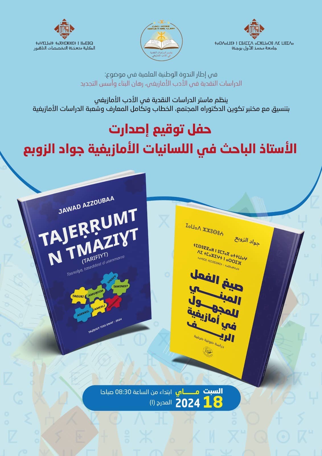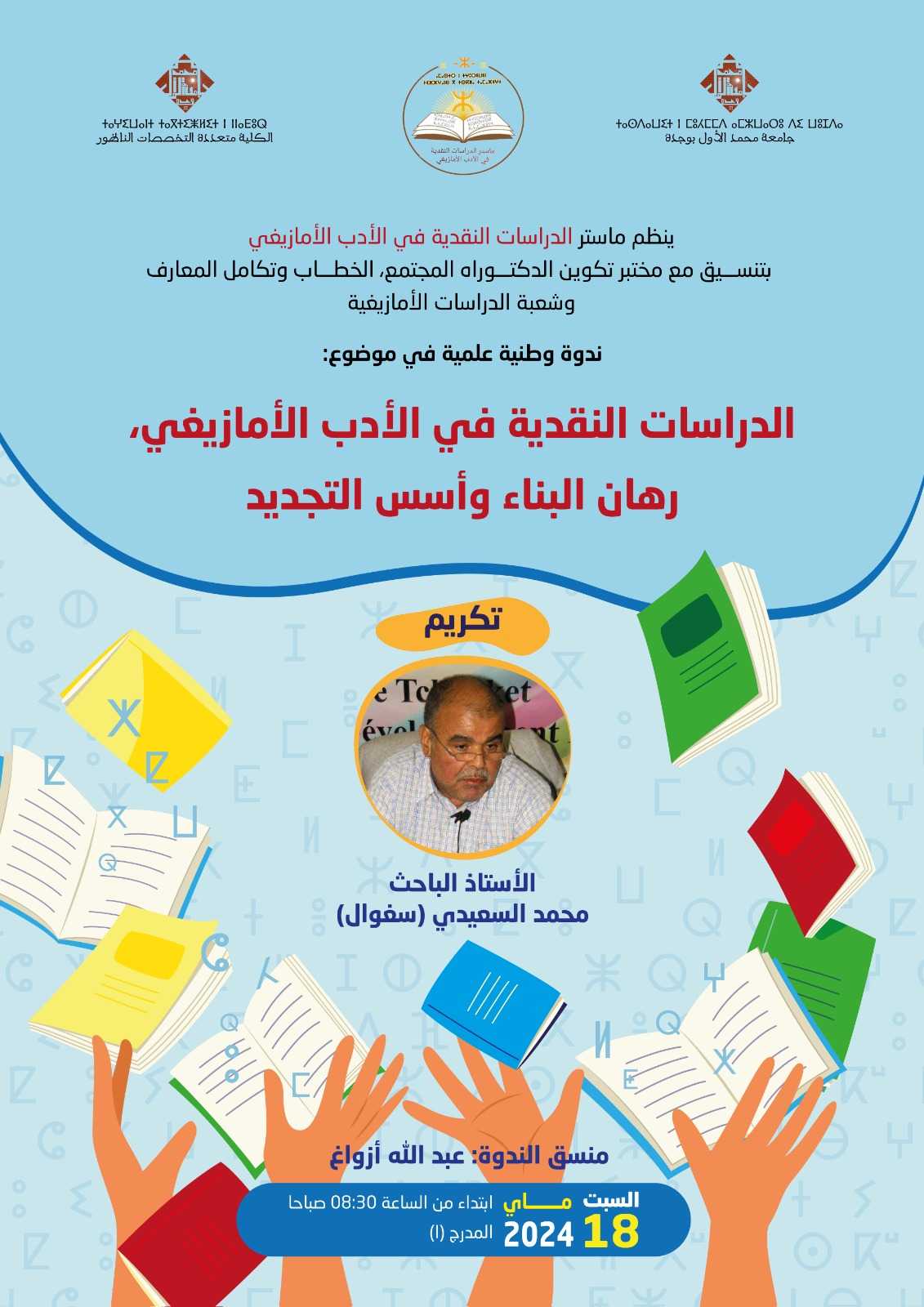 ينظم ماستر الدراسات النقدية في الأدب الأمازيغي بالتعاون مع مختبر تكوين الدكتوراه المجتمع، الخطاب وتكامل المعارف وشعبة الدراسات الأمازيغية، الكلية المتعددة التخصصات بالناظور، جامعة محمد الأول بوجدة، ندوة وطنية علمية تحت عنوان “الدراسات النقدية في الأدب الأمازيغي: رهان البناء وأسس التجديد”. . تأتي هذه الندوة لتسليط الضوء على أهمية النقد في تطور الأدب الأمازيغي وإبراز إسهامات الباحثين في هذا المجال.